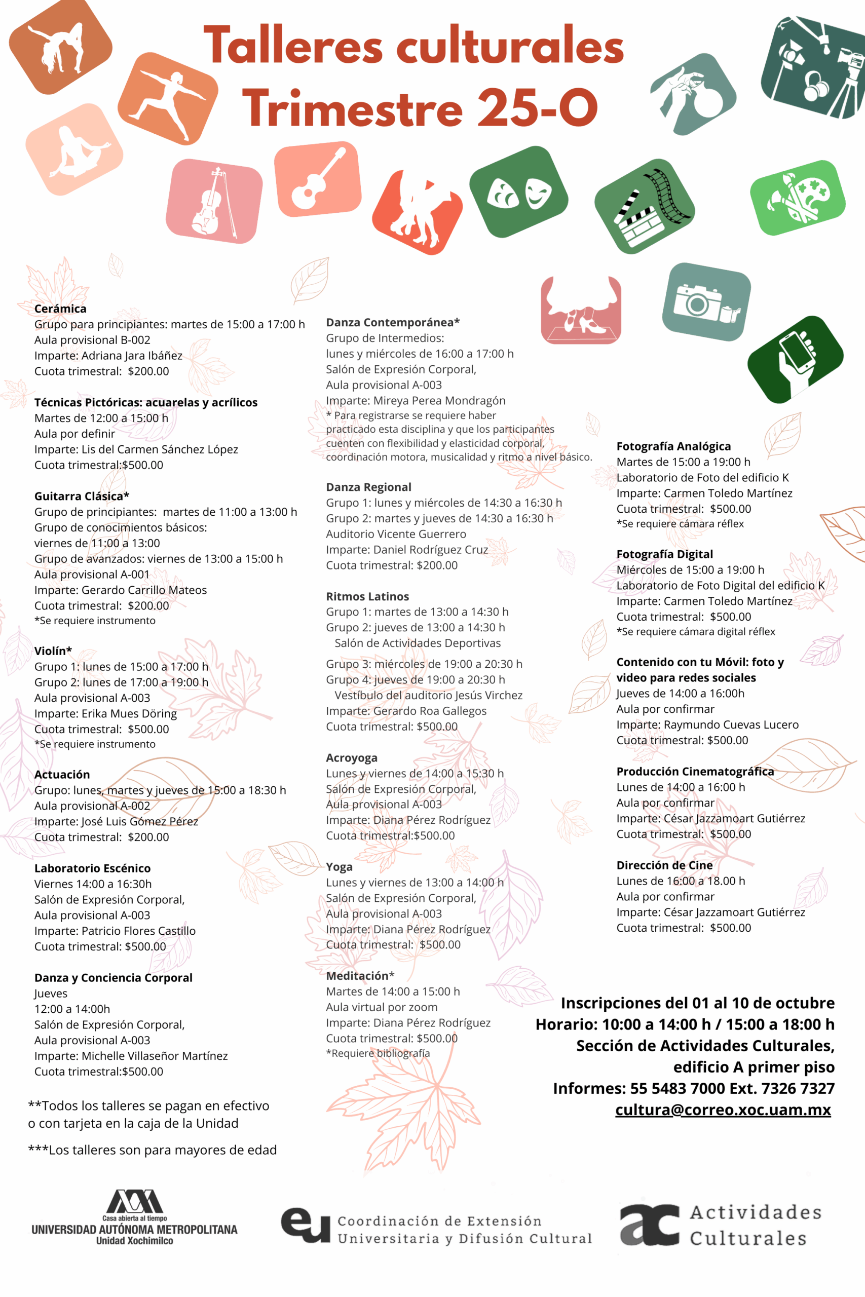 eventos (talleres, conciertos, presentaciones, puestas en escena, etc.) para la comunidad universitaria y público en general a través de proyectos que difunden las distintas disciplinas artísticas (danza, cine, teatro, música, etc.).